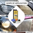 Use the white sponge tray provided in the kit to apply the protective liquid evenly on the surface of the lens. After applying, leave for 10-15 minutes to allow the liquid to flow evenly, and then immediately dry it under direct sunlight (1 to 2 hours is recommended.) Otherwise, due to its viscosity, the protective liquid will adhere to dust and other dirt, thereby affecting the brightness of the headlights.
